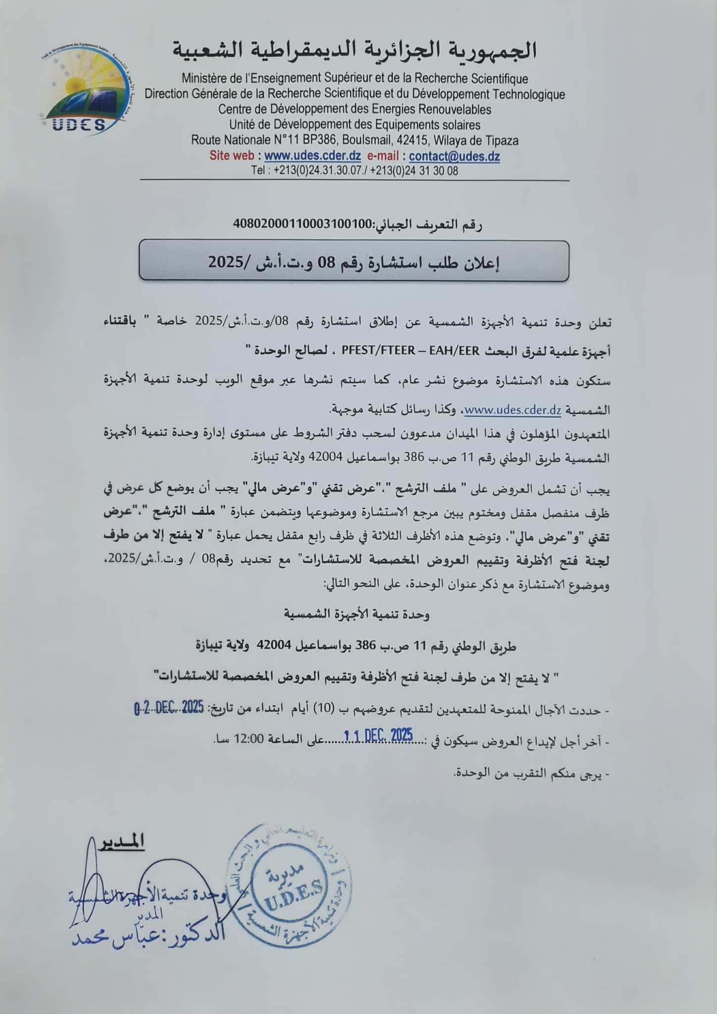 06/UDES/2024 اعلان عن عدم جدوى للحصص رقم 02ـ03ـ04 للاستشارة رقم إعلان طلب إستشارة رقم 05/و.ت.أ.ش/2024 إعلان عن منح مؤقت لإستشارة رقم 03/ وت أ ش/2024 إعلان عن عدم جدوى للإستشارة رقم 05/و.ت.أ.ش/2024 إعلان طلب إستشارة رقم 06/و.ت.أ.ش/2024 خاصة بأشغال تهيئة لصالح وحدة تنمية الأجهزة الشمسية إعلان عن منح مؤقت للحصة رقم 01 لإستشارة رقم 04/ و.ت.أ.ش/2024 اعلان عن عدم جدوى للحصة رقم 03 استشارة رقم 04/ و.ت.أ.ش/2024 إعلان طلب إستشارة رقم 05/و.ت.أ.ش/2024 خاصة لاقتناء أجهزة علمية إعلان طلب إستشارة رقم 04/و.ت.أ.ش/2024 خاصة لاقتناء معدات الإعلام الآلي إعلان طلب إستشارة رقم 03/و.ت.أ.ش/2024 خاصة لاقتناء أجهزة علمية اعلان عن عدم جدوى للحصة رقم 04 استشارة رقم 02/ و.ت.أ.ش/2024 إعلان عن منح مؤقت لإستشارة رقم 02/ وت أ ش/2024 إعلان طلب إستشارة رقم 02/و.ت.أ.ش/2024 إعلان عن منح مؤقت لإستشارة رقم 01/ وت أ ش/2024 إعلان طلب إستشارة رقم 01/و.ت.أ.ش/2024 Info